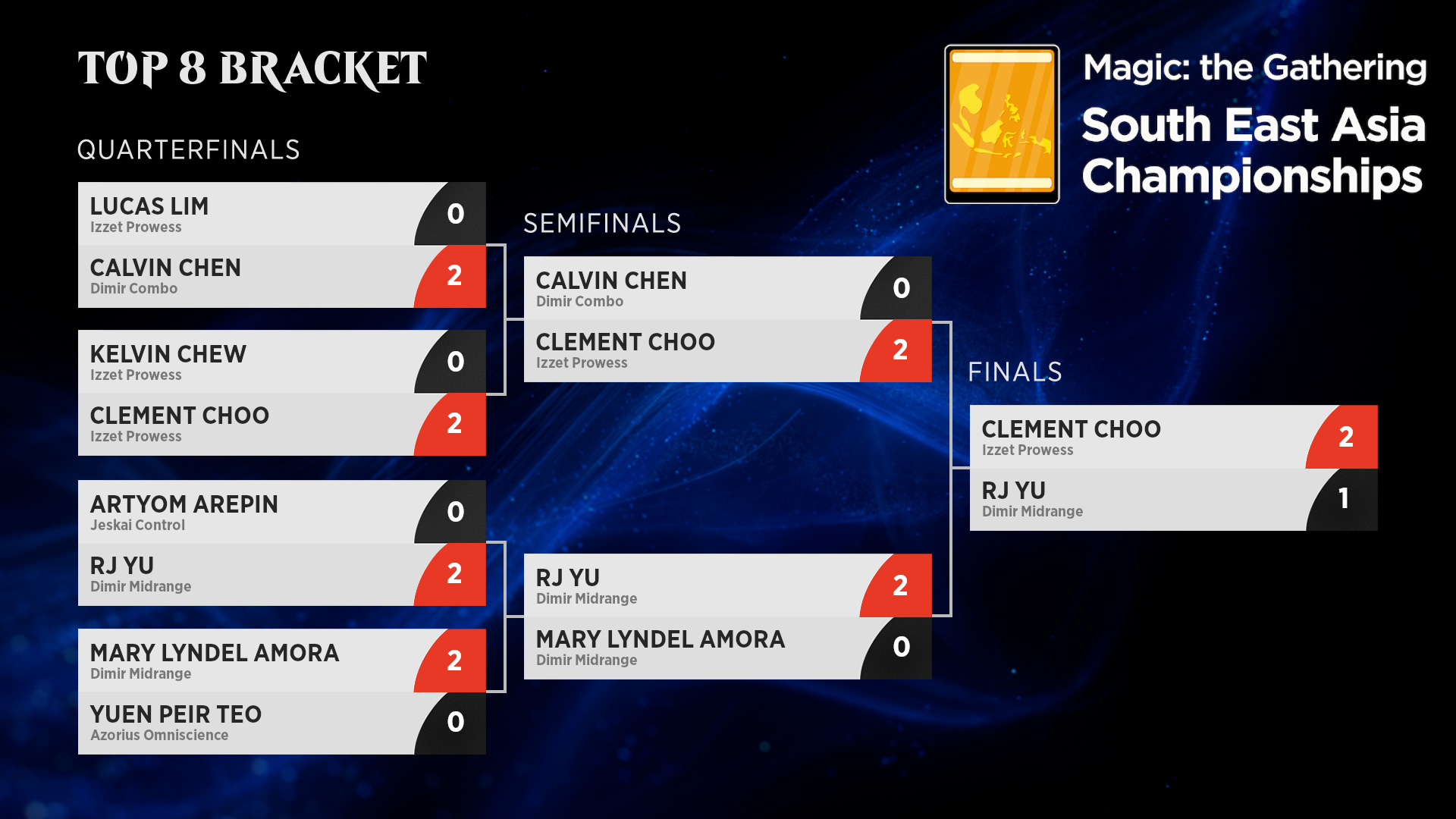 Choo wasn't the only player on Izzet Prowess who made it all the way to the Top 8. Lucas Lim and Kelvin Chew were also playing Izzet, while several different Dimir decks also made appearances: Calvin Chen played Dimir Combo, while RJ Yu was joined by Mary Lyndel Amora with Dimir Midrange. Rounding out the Top 8 were Yuen Peir Teo, playing Azorius Omniscience and finally Artyom Arepin on Jeskai Control. From aggro to combo and midrange to control, this Top 8 had a bit of everything.