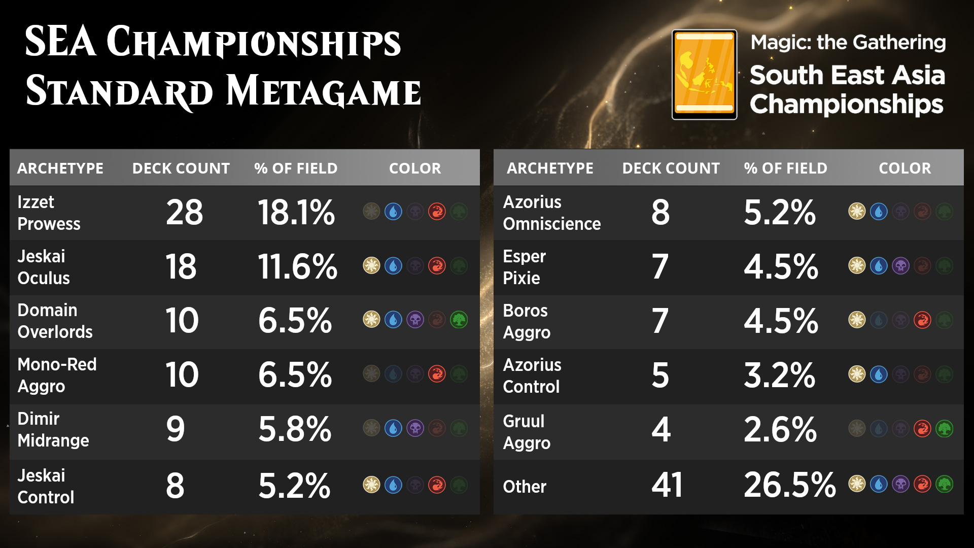 While Izzet Prowess was both the most played deck and the deck that won the entire tournament, there was a wide variety of strategies and archetypes represented in Kuala Lumpur. Oculus and Domain decks, despite their numbers, didn't do very well—the best-performing decks tended to be either faster aggressive lists or slower controlling lists. Both Azorius and Jeskai Control performed strongly (the 9th-place finisher, Marlon Kane Cruz, played Azorius). Meanwhile the disruption-heavy deck Dimir Midrange put on an impressive show.