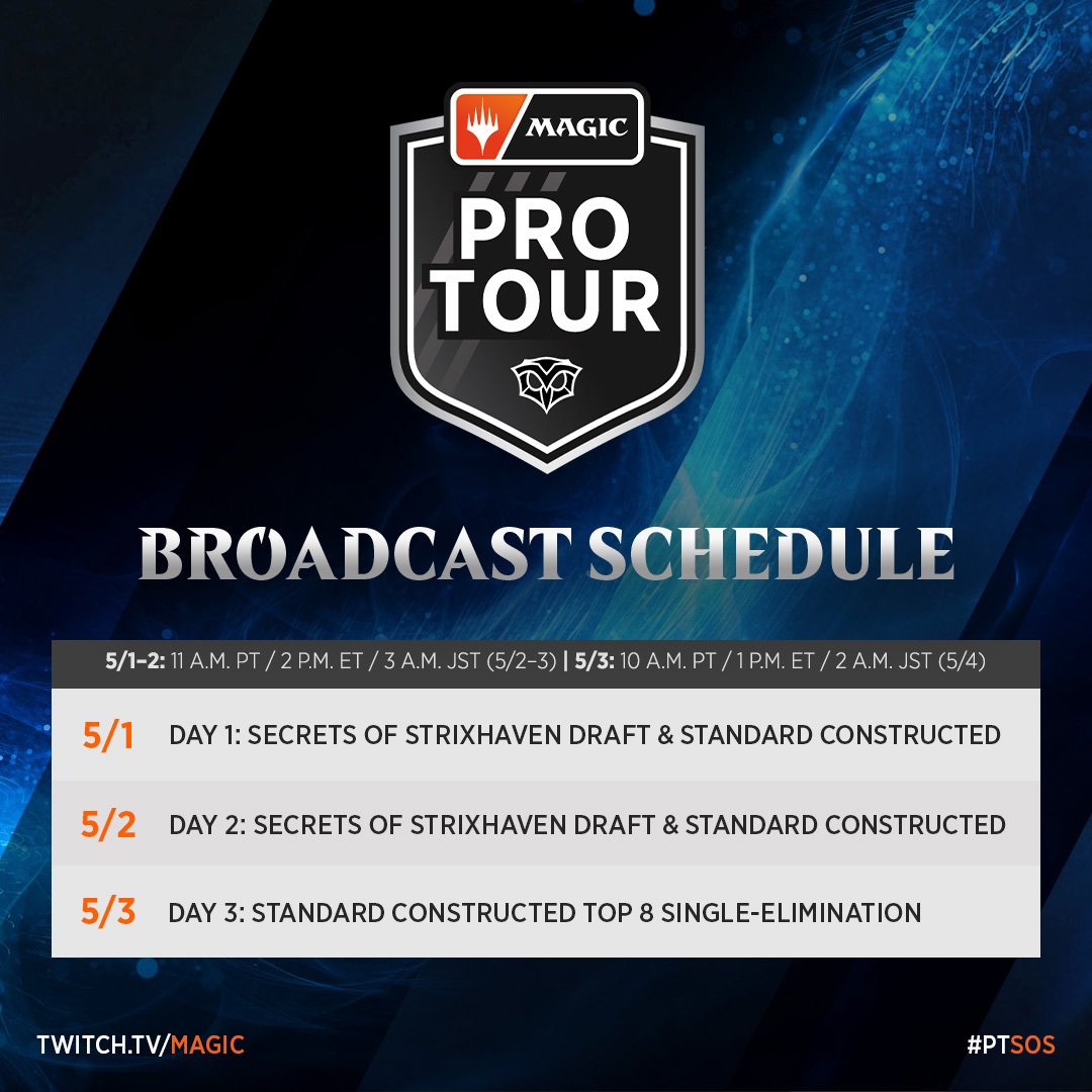 Pro Tour Secrets of Strixhaven will take place in Las Vegas, Nevada, USA, on May 1–3 as part of MagicCon: Las Vegas. MagicCon attendees can watch the action on the show floor. If you can't make it to the event, don't worry! You can stay up to date on all the action with our coverage, which will be streamed all three days of the event at twitch.tv/magic and youtube.com/@Play_MTG. Follow the players, their fans, and all the coverage at @Play_MTG or with the hashtag #PTSOS.
