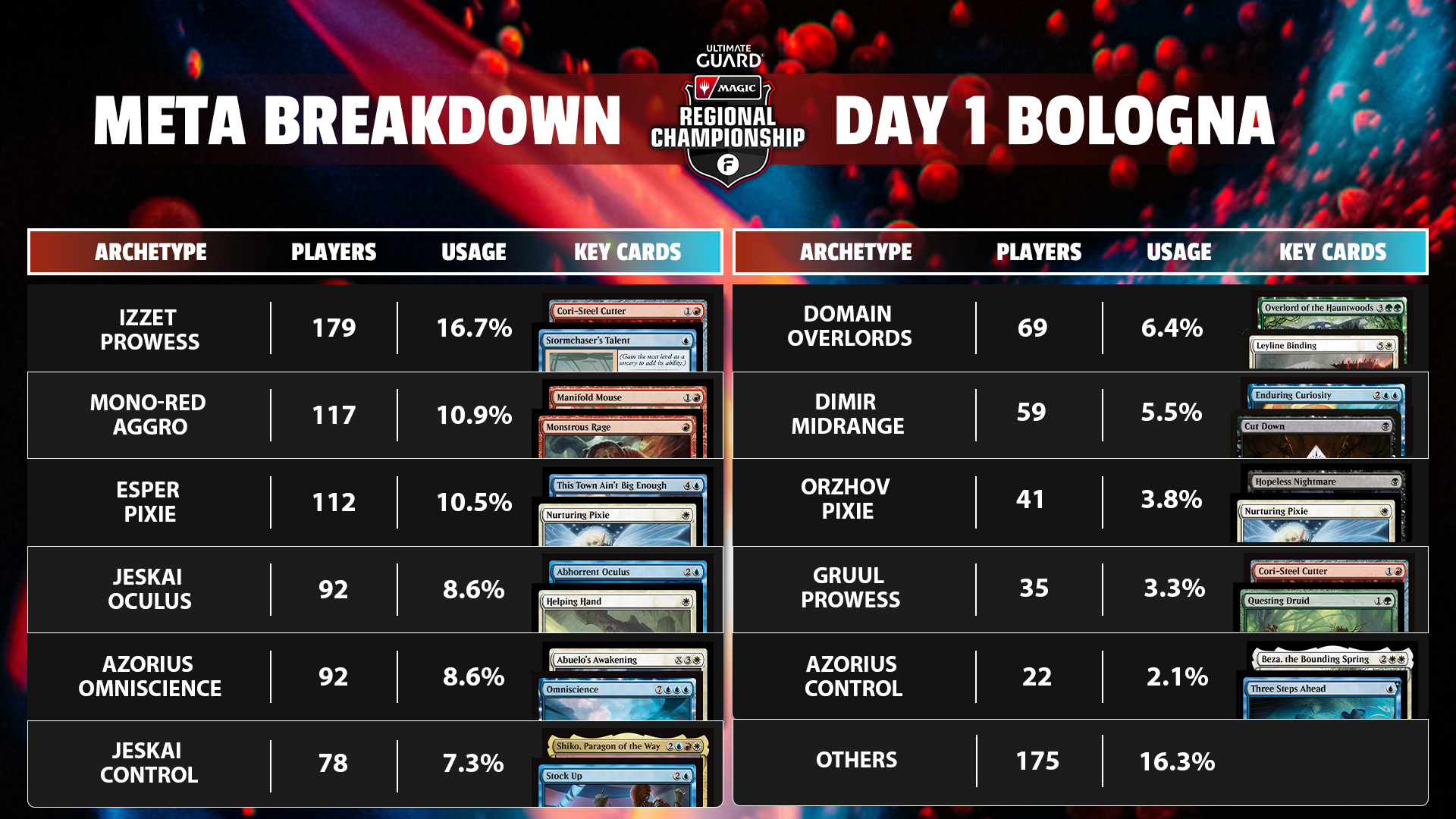 The Top 8 decks featured three Izzet Prowess decks, two Mono-Red Aggro decks, two Dimir Midrange decks, and one Domain Overlords decks. While