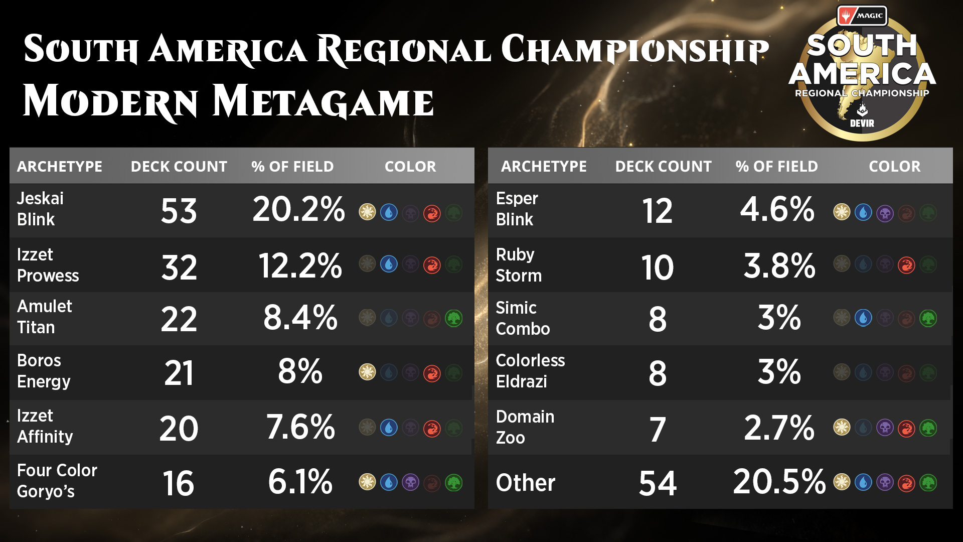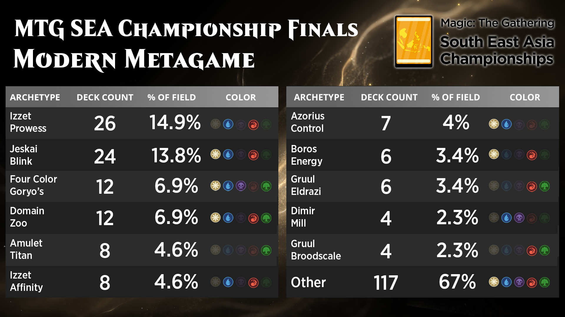 Izzet Prowess and Jeskai Blink were the two favorite decks across both events, though players in Southeast Asia slightly preferred Izzet, while more competitors in South America chose Jeskai.