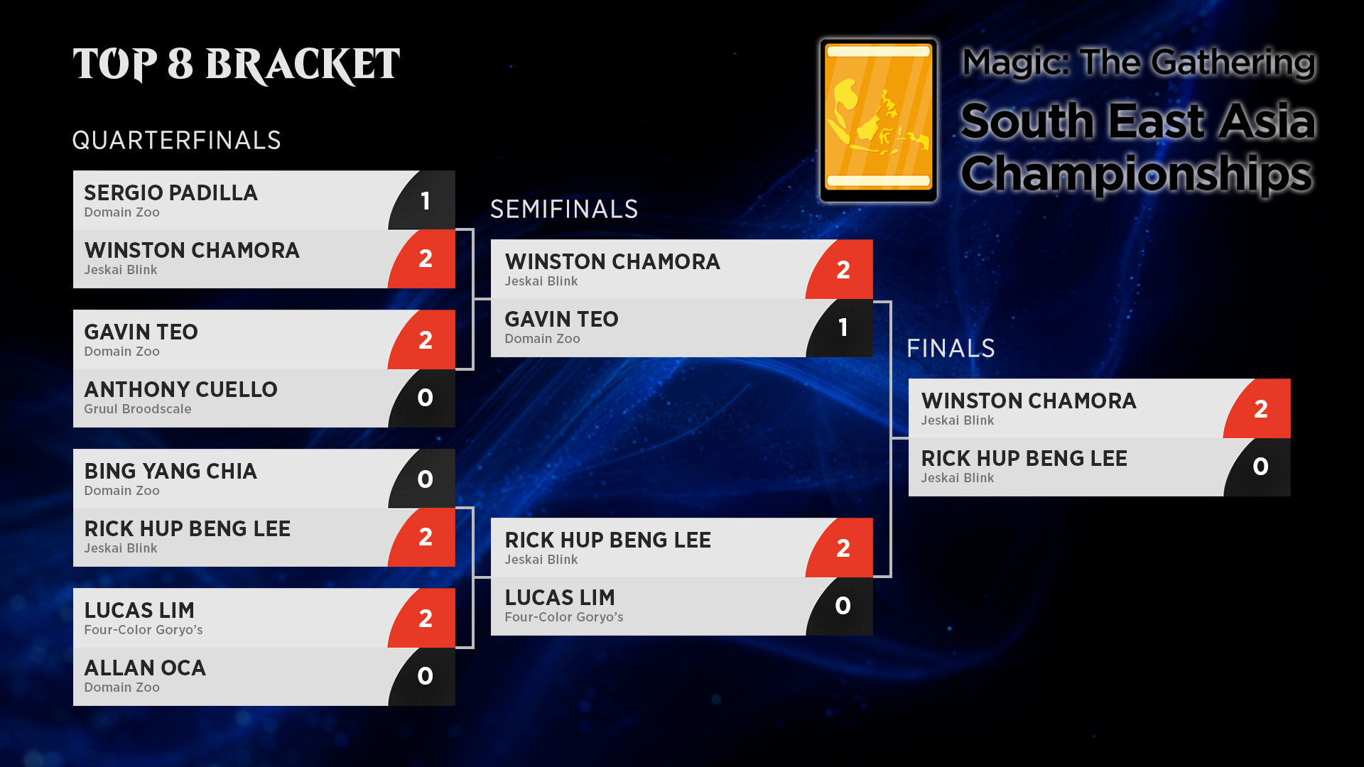 The Southeast Asia Regional Championship Top 8 included Sergio Padilla, Winston Chamora, Gavin Teo, Anthony Cuello, Bing Yang Chia, Rick Hup Beng Lee, Lucas Lim, and Allan Oca.