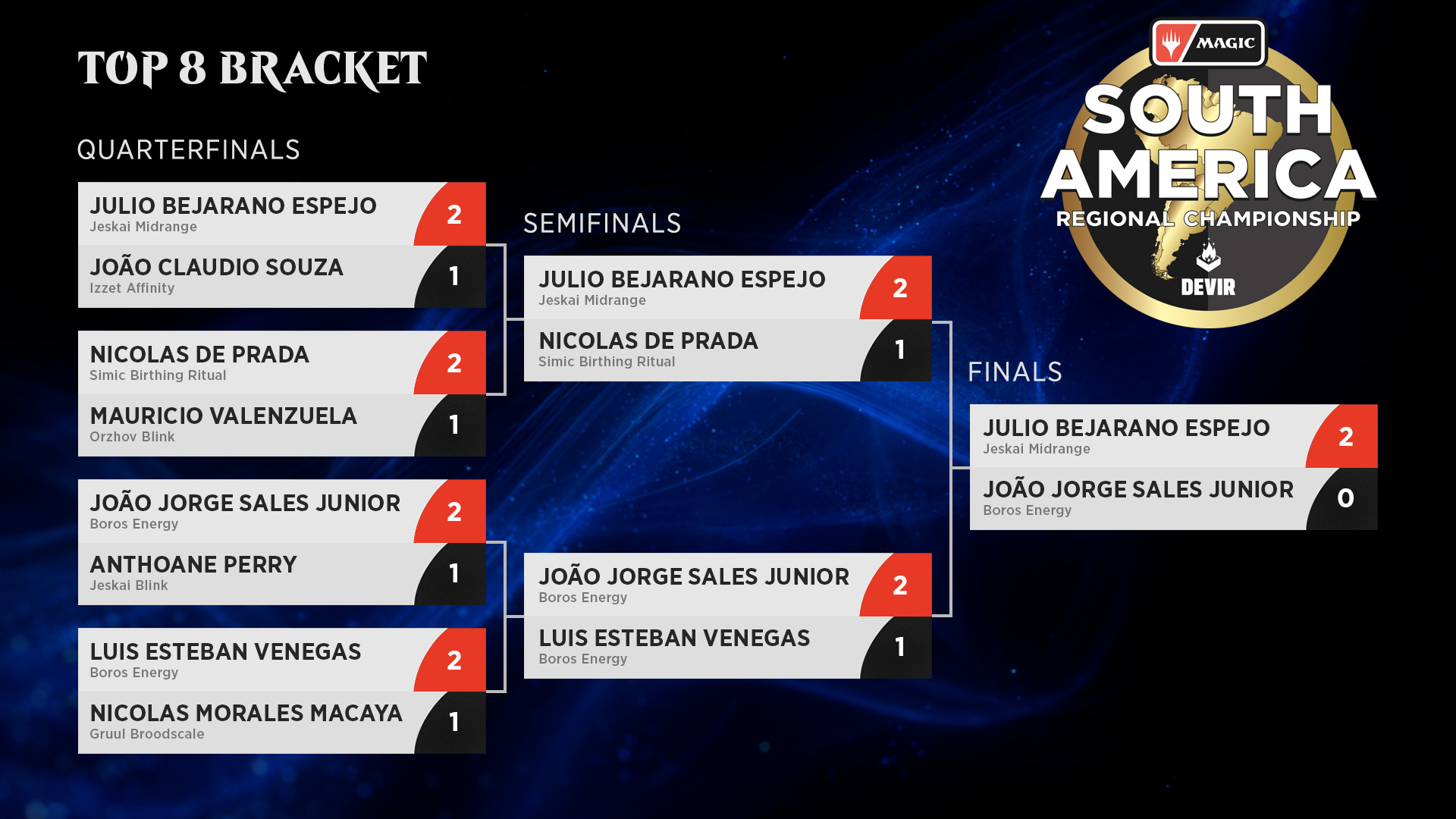 The South America Regional Championship Top 8 included Julio Bejarano Espejo, João Claudio Souza, Nicolas De Prada, Mauricio Valenzuela, João Jorge Sales Junior, Anthony Perry, Luis Esteban Venegas, and Nicolas Morales Macaya.