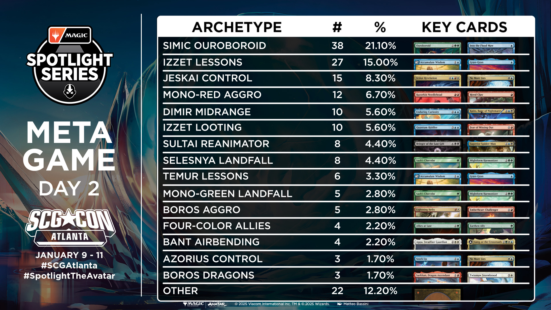 The biggest winner between Day One and Day Two of the Spotlight event was Simic Ouroboroid, which saw its share of the metagame jump from 15% to 21%. Izzet Lessons and Jeskai Control both saw a modest increase, while Dimir Midrange players saw a drop-off between the first and second days.