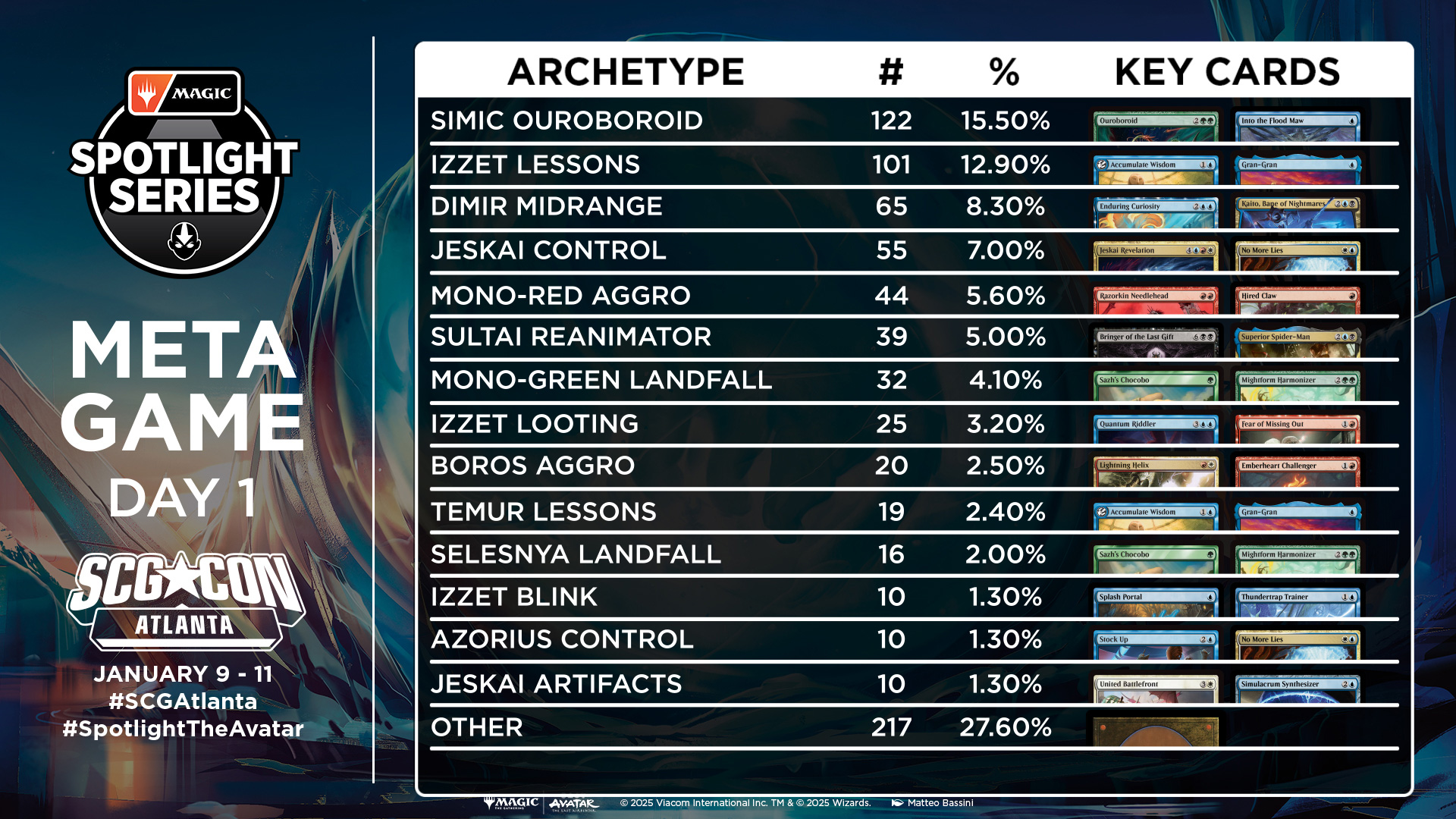 While recent World Championship all-star deck Izzet Lessons was the top pick of players in Lyon, Simic Ouroboroid sat atop the metagame in Atlanta. It was closely followed by Izzet Lessons, then by Dimir Midrange, which continues to keep ahold of its place in the Standard environment. Landfall decks gained ground in the metagame, with both Selesnya and mono-green variants making it as far as the Top 8.
