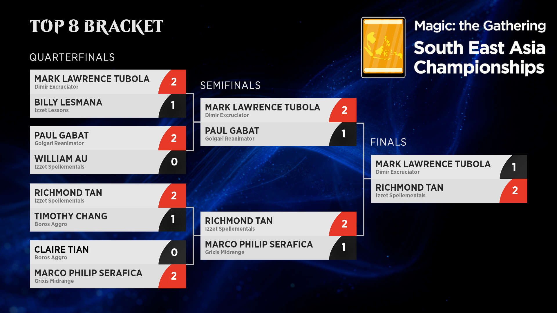 Tan had put up some respectable results at prior SEA Championships—not to mention having a PT Top 32 to his name—and was able to take down the weekend after dispatching Mark Lawrence Tubola and his Dimir Excruciator deck in the final match. Tan had to fight for every match win throughout the Top 8, with each one coming with a 2-1 scoreline. In doing so, he secured not just the trophy but the chance to represent his region at the next Magic World Championship.