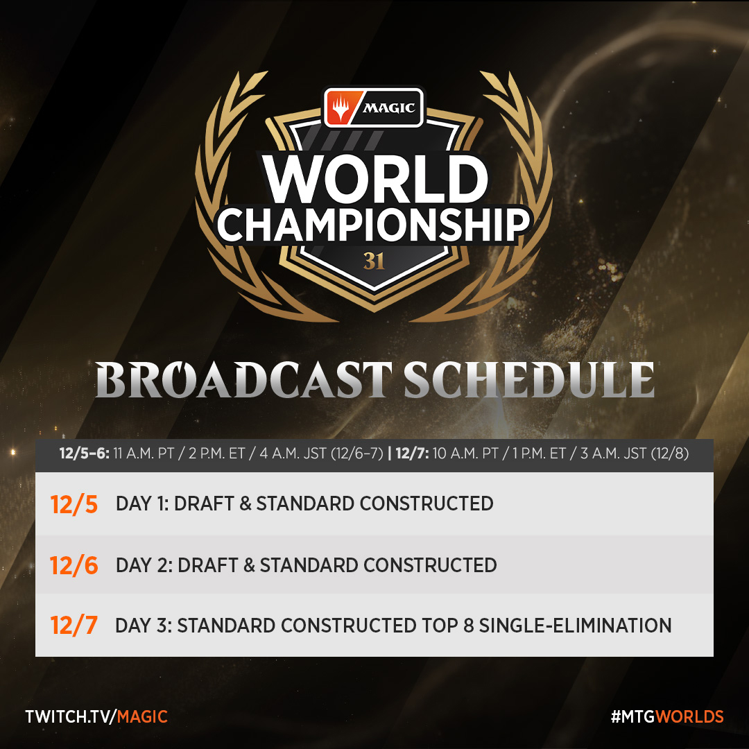You can watch coverage for World Championship 31 each day here at Magic.gg and at twitch.tv/magic and youtube.com/@Play_MTG.